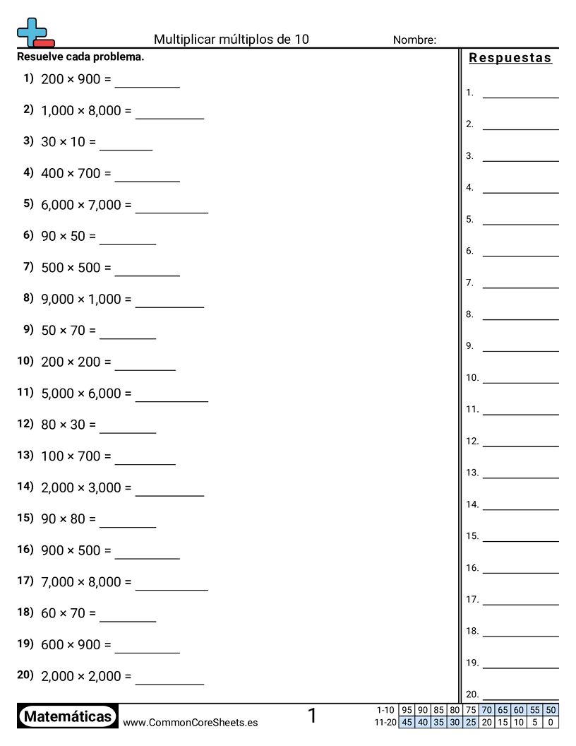 Hojas de trabajo gratis de math sobre Multiplicar múltiplos de 10. Cada hoja tiene 20 ejercicios con hoja de respuestas y es ideal para maestros y educación en casa. Puedes descargar el PDF, crear tarjetas de memoria o configurarlo para aprendizaje en línea.