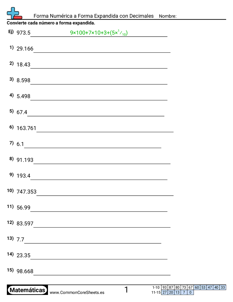 Hojas de trabajo gratis de math para 5to Grado (5nbt3a) sobre Forma Numérica a Forma Expandida con Decimales. Cada hoja tiene 15 ejercicios con hoja de respuestas y es ideal para maestros y educación en casa. Puedes descargar el PDF, crear tarjetas de memoria o configurarlo para aprendizaje en línea.