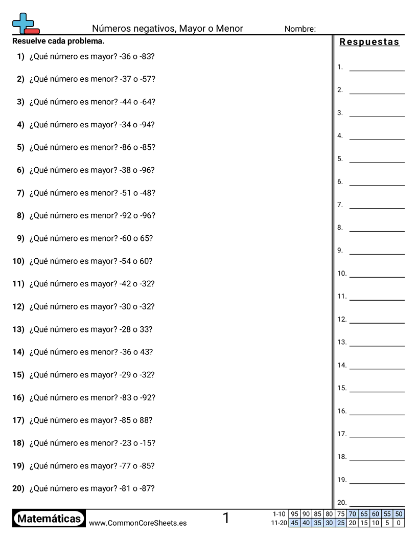 Hojas de trabajo gratis de math para 6to Grado (6ns6a) sobre Números negativos, Mayor o Menor. Cada hoja tiene 20 ejercicios con hoja de respuestas y es ideal para maestros y educación en casa. Puedes descargar el PDF, crear tarjetas de memoria o configurarlo para aprendizaje en línea.