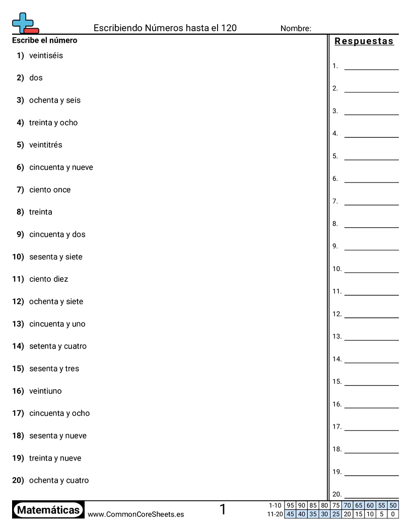 Hojas de trabajo gratis de math para 1er Grado (1nbt1) sobre Escribiendo Números hasta el 120. Cada hoja tiene 20 ejercicios con hoja de respuestas y es ideal para maestros y educación en casa. Puedes descargar el PDF, crear tarjetas de memoria o configurarlo para aprendizaje en línea.