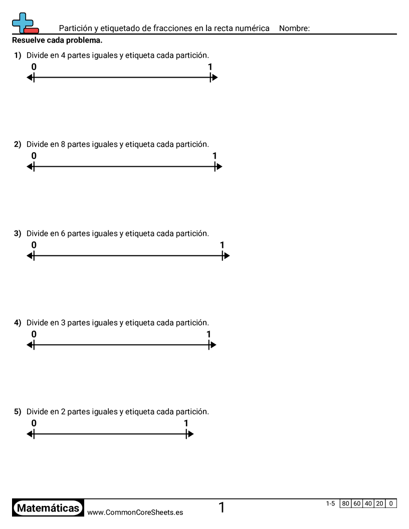 Hojas de trabajo gratis de math para 3er Grado (3nf2a) sobre Partición y etiquetado de fracciones en la recta numérica. Cada hoja tiene 5 ejercicios con hoja de respuestas y es ideal para maestros y educación en casa. Puedes descargar el PDF, crear tarjetas de memoria o configurarlo para aprendizaje en línea.