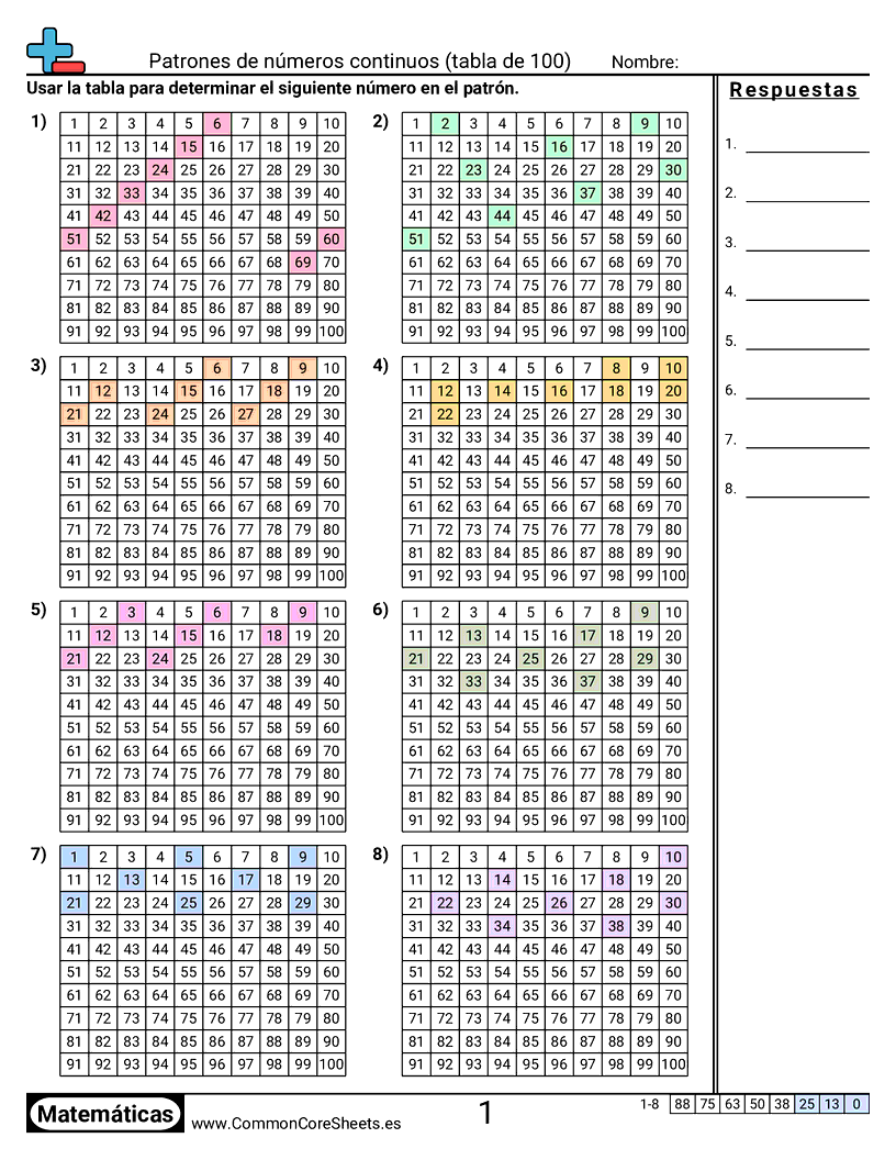 Hojas de trabajo gratis de math sobre Patrones de números continuos (tabla de 100). Cada hoja tiene 8 ejercicios con hoja de respuestas y es ideal para maestros y educación en casa. Puedes descargar el PDF, crear tarjetas de memoria o configurarlo para aprendizaje en línea.