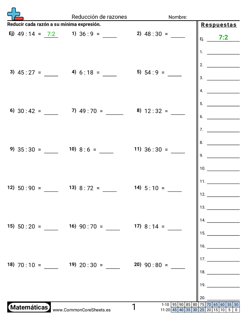 Cada hoja contiene 20 problemas reduciendo una relación a su forma más baja.