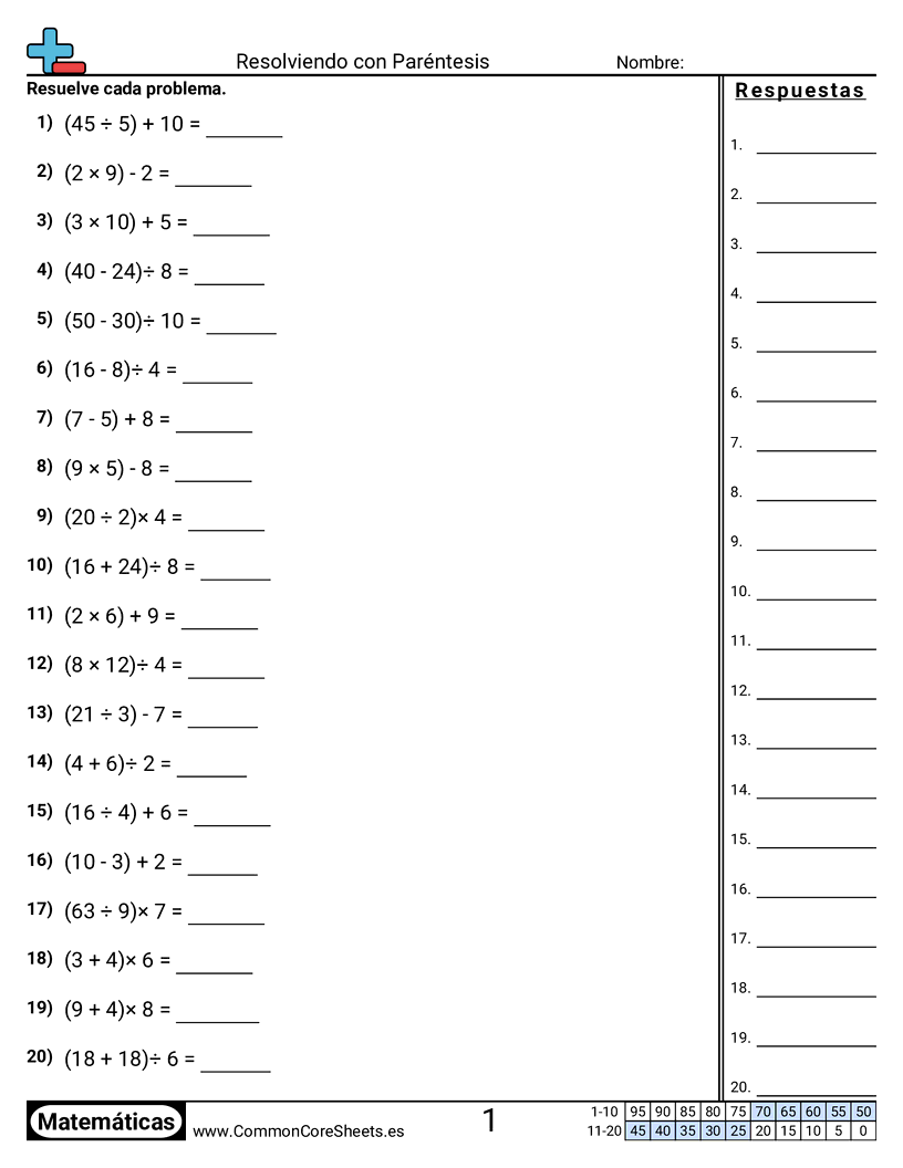 Hojas de trabajo gratis de math para 5to Grado (5oa1) sobre Resolviendo con Paréntesis. Cada hoja tiene 20 ejercicios con hoja de respuestas y es ideal para maestros y educación en casa. Puedes descargar el PDF, crear tarjetas de memoria o configurarlo para aprendizaje en línea.