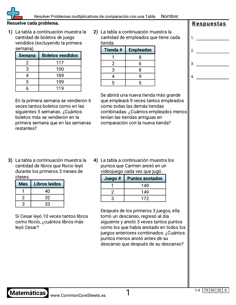 Hojas de trabajo gratis de math para 4to Grado (4oa2) sobre Resolver Problemas multiplicativos de comparación con una Tabla. Cada hoja tiene 4 ejercicios con hoja de respuestas y es ideal para maestros y educación en casa. Puedes descargar el PDF, crear tarjetas de memoria o configurarlo para aprendizaje en línea.