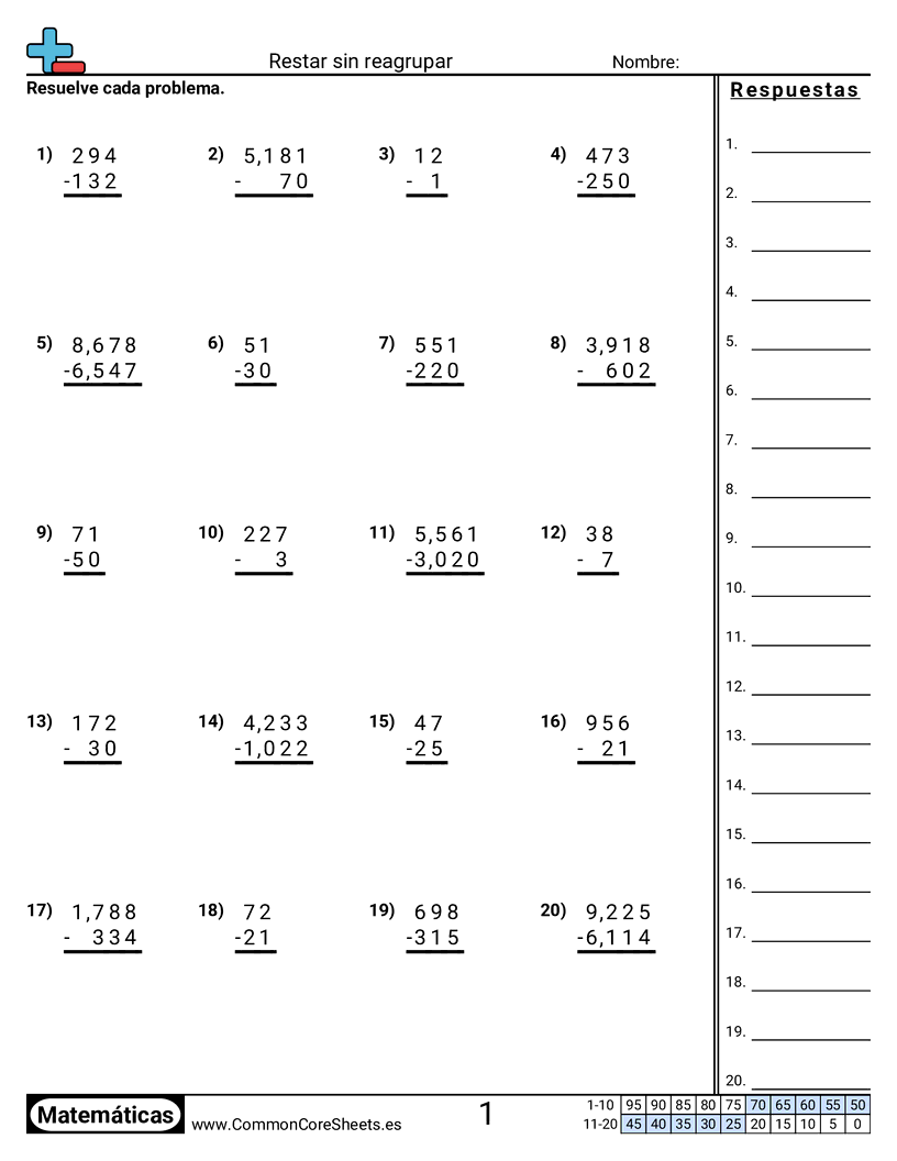 Hojas de trabajo gratis de math sobre Restar sin reagrupar. Cada hoja tiene 20 ejercicios con hoja de respuestas y es ideal para maestros y educación en casa. Puedes descargar el PDF, crear tarjetas de memoria o configurarlo para aprendizaje en línea.