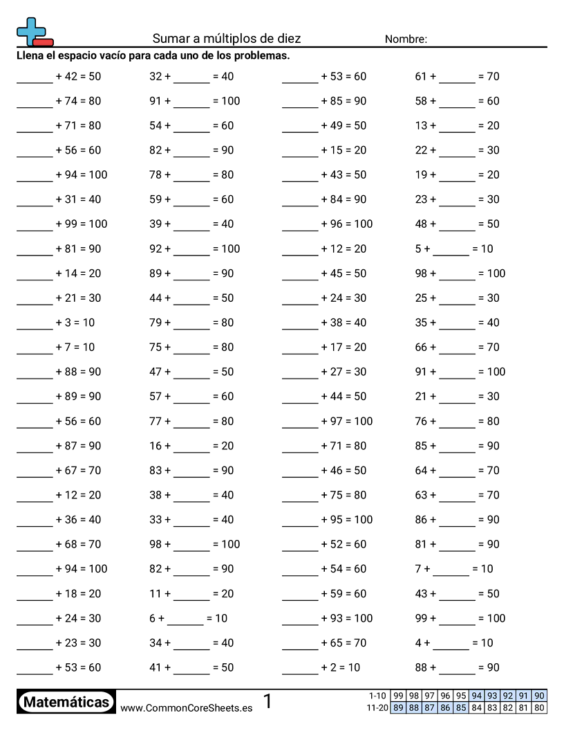 Cada hoja de cálculo tiene 100 problemas para identificar lo que hay que sumar para igualar a un múltiplo de 10.