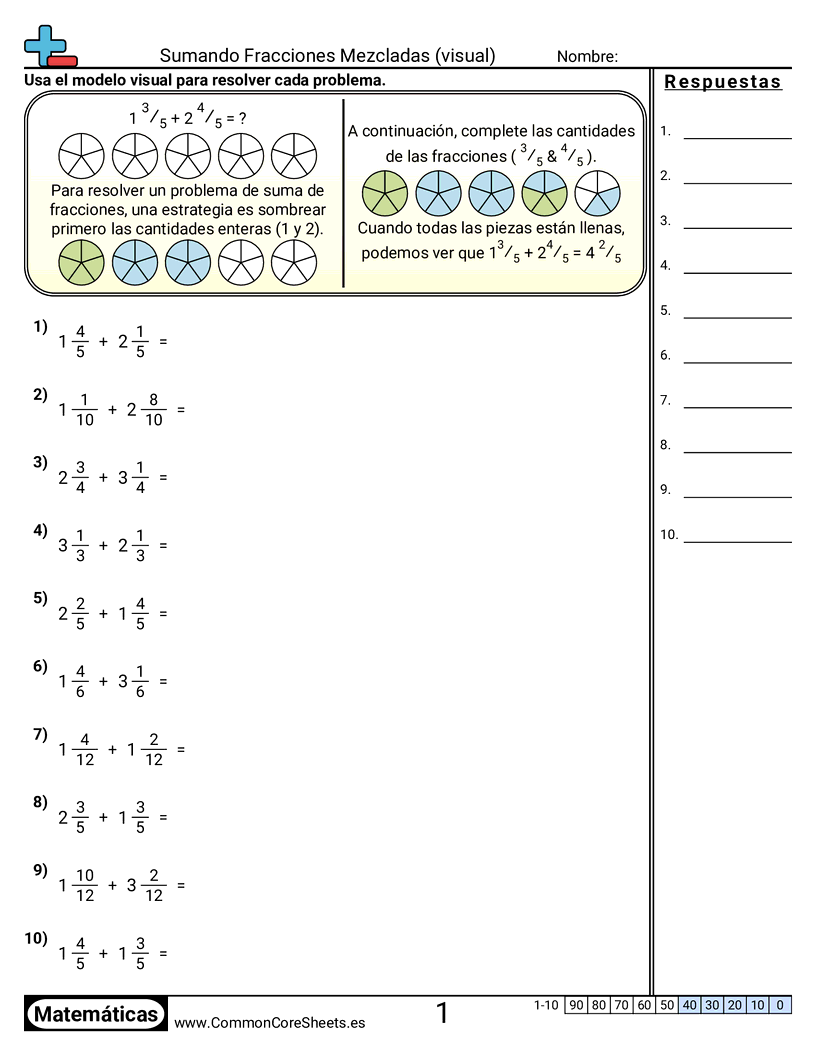 Hojas de trabajo gratis de math para 4to Grado (4nf3c) sobre Sumando Fracciones Mezcladas (visual). Cada hoja tiene 10 ejercicios con hoja de respuestas y es ideal para maestros y educación en casa. Puedes descargar el PDF, crear tarjetas de memoria o configurarlo para aprendizaje en línea.