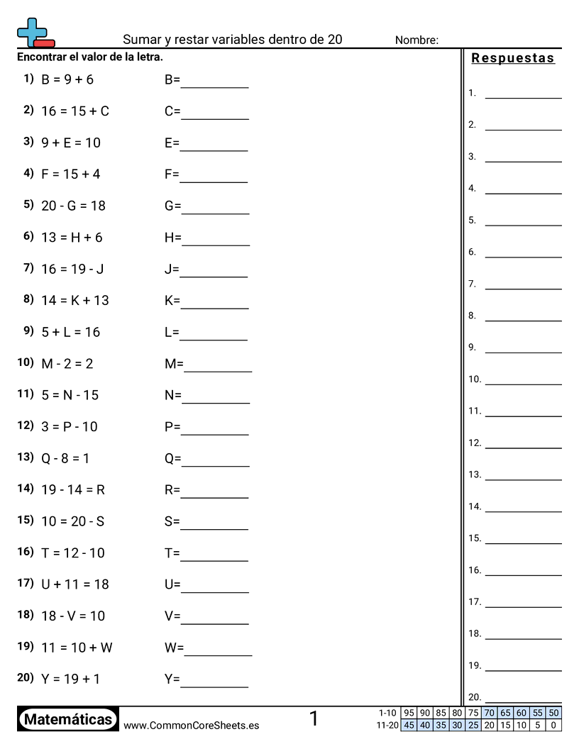 Hojas de trabajo gratis de math para 1er Grado (1oa1) sobre Sumar y restar variables dentro de 20. Cada hoja tiene 20 ejercicios con hoja de respuestas y es ideal para maestros y educación en casa. Puedes descargar el PDF, crear tarjetas de memoria o configurarlo para aprendizaje en línea.