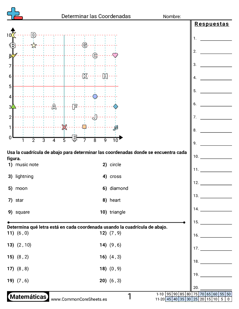 Hojas de trabajo gratis de math para 5to Grado (5g2) sobre Determinar las Coordenadas. Cada hoja tiene 20 ejercicios con hoja de respuestas y es ideal para maestros y educación en casa. Puedes descargar el PDF, crear tarjetas de memoria o configurarlo para aprendizaje en línea.