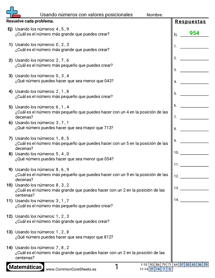 Hojas de trabajo gratis de math sobre Usando números con valores posicionales. Cada hoja tiene 14 ejercicios con hoja de respuestas y es ideal para maestros y educación en casa. Puedes descargar el PDF, crear tarjetas de memoria o configurarlo para aprendizaje en línea.